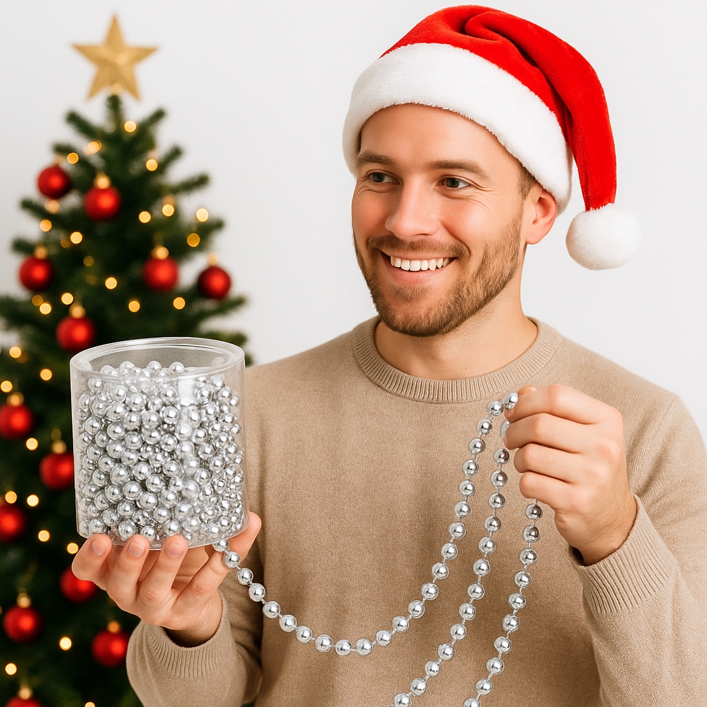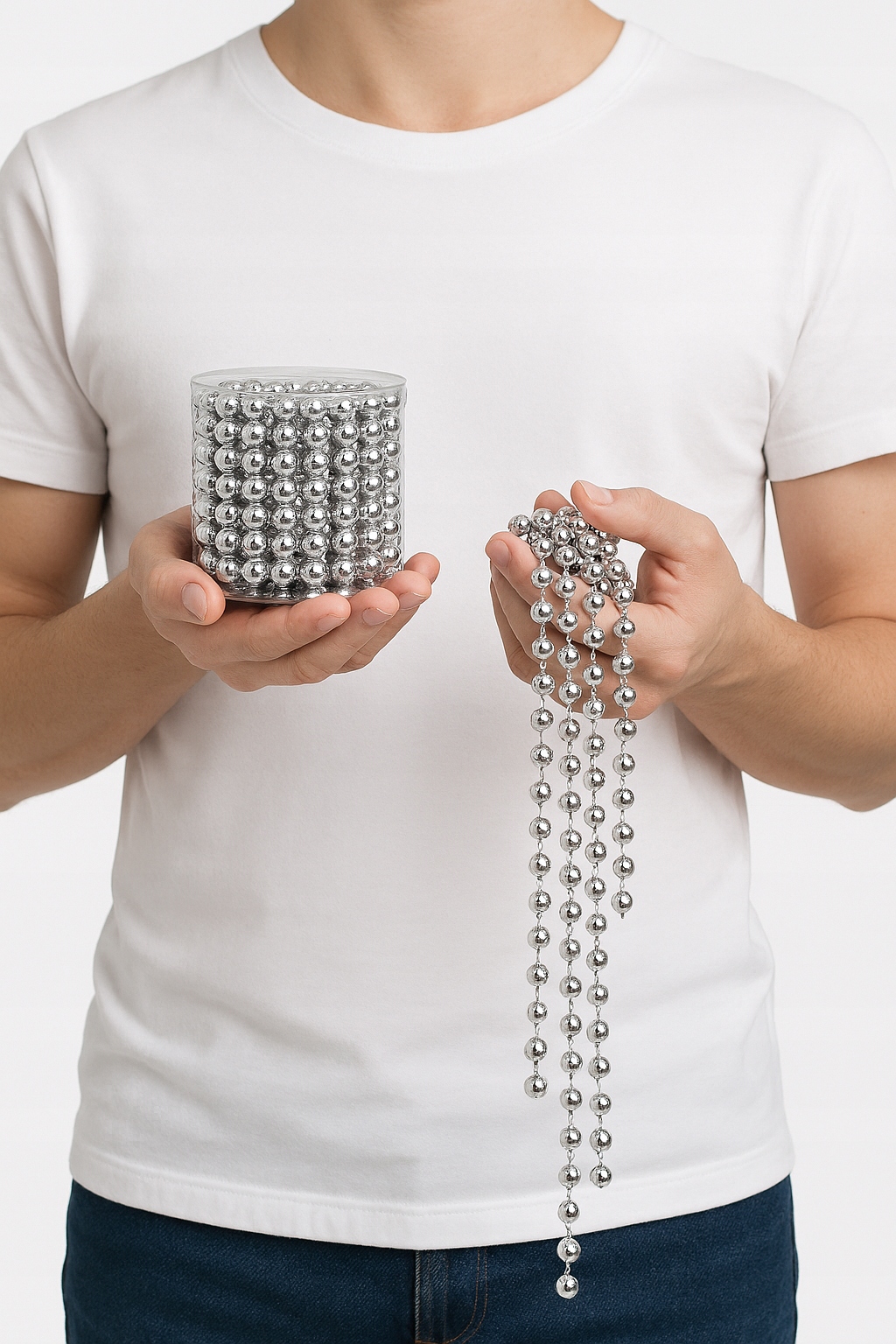 Szukasz klasycznej, a zarazem efektownej dekoracji świątecznej? Ten łańcuch choinkowy z koralików w kolorze srebrnym to idealny wybór! Wykonany z błyszczących, kulistych koralików nawleczonych na elastyczny sznurek, tworzy piękną girlandę, która doskonale prezentuje się na choince, stroikach, kominku czy w oknach.
