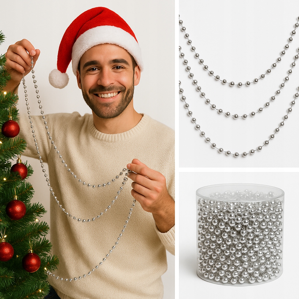 SREBRNY ŁAŃCUCH CHOINKOWY – GIRLANDA Z KORALIKÓW 5M